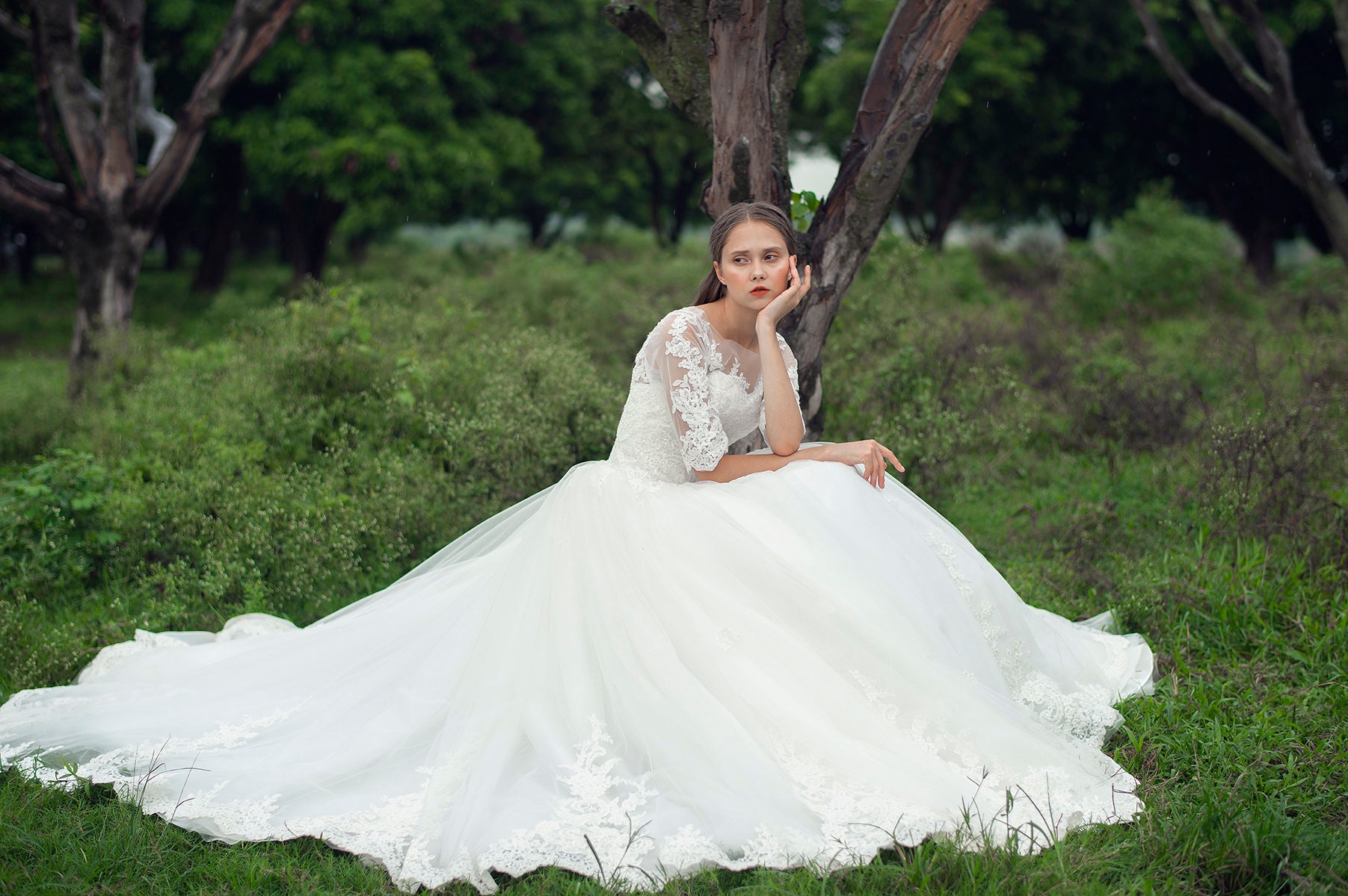 This wedding dress has a bottom skirt bloom due to the many layers of tulle ruffled at the waist. The skirt is embellished with beautiful lace. The top has a corset form to help you the reinforce for a neat look. The thin tulle shoulder with see-through and apply the flower laces and beads that make you look smaller.